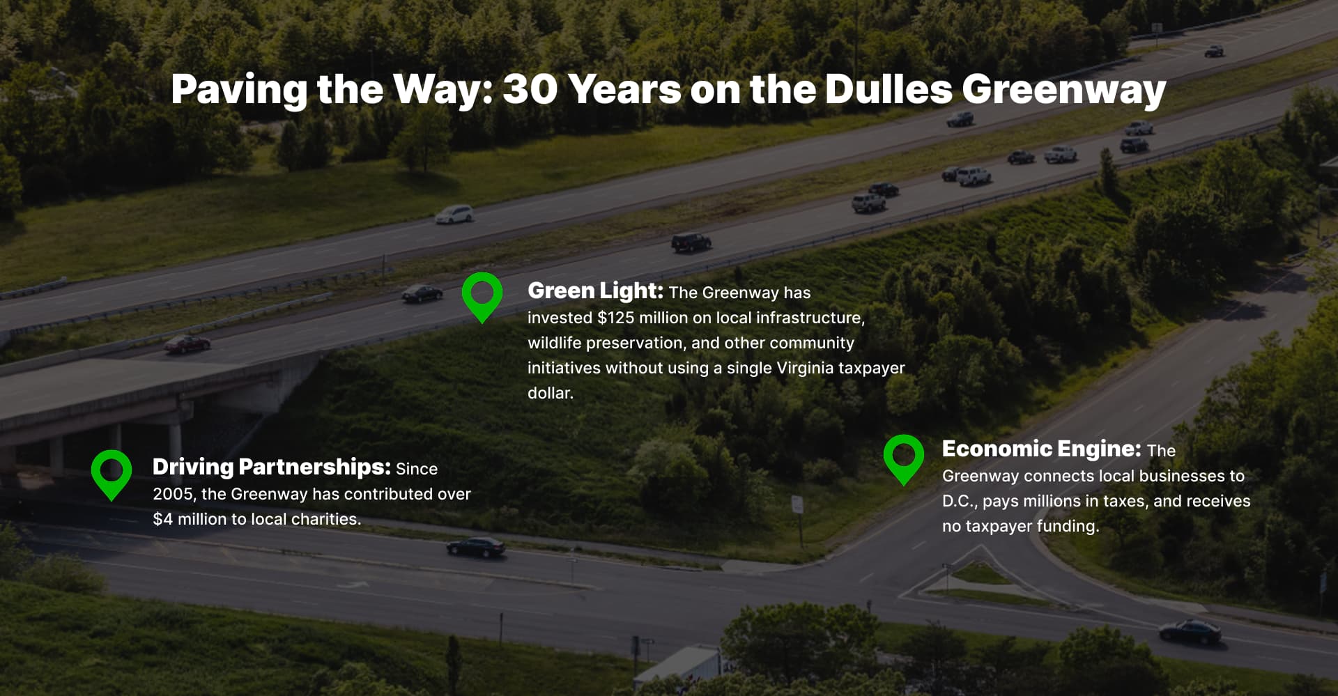 The Dulles Greenway provides a faster trip for the average Northern Virginia commute, with traffic moving at 65 miles an hour and saving commuters an hour and 20 minutes over the course of a week at peak travel times. The Dulles Greenway offers a consistent and middle of the price range transportation option when evaluating price per mile, which is important given the high costs for transportation in the DMV region.